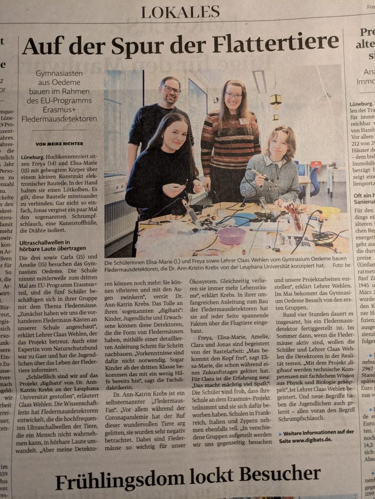 • Krebs, A.‑K., Kasper, L., Kuhn, J. & Wilhelm, T. (2022). Mit Echo Meter auf Fledermauspirsch. Physik in unserer Zeit, 53(2), 96–97. https://doi.org/10.1002/piuz.202270212